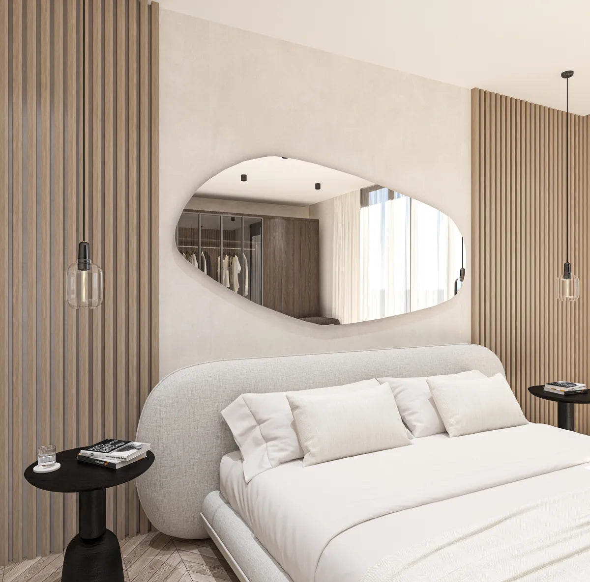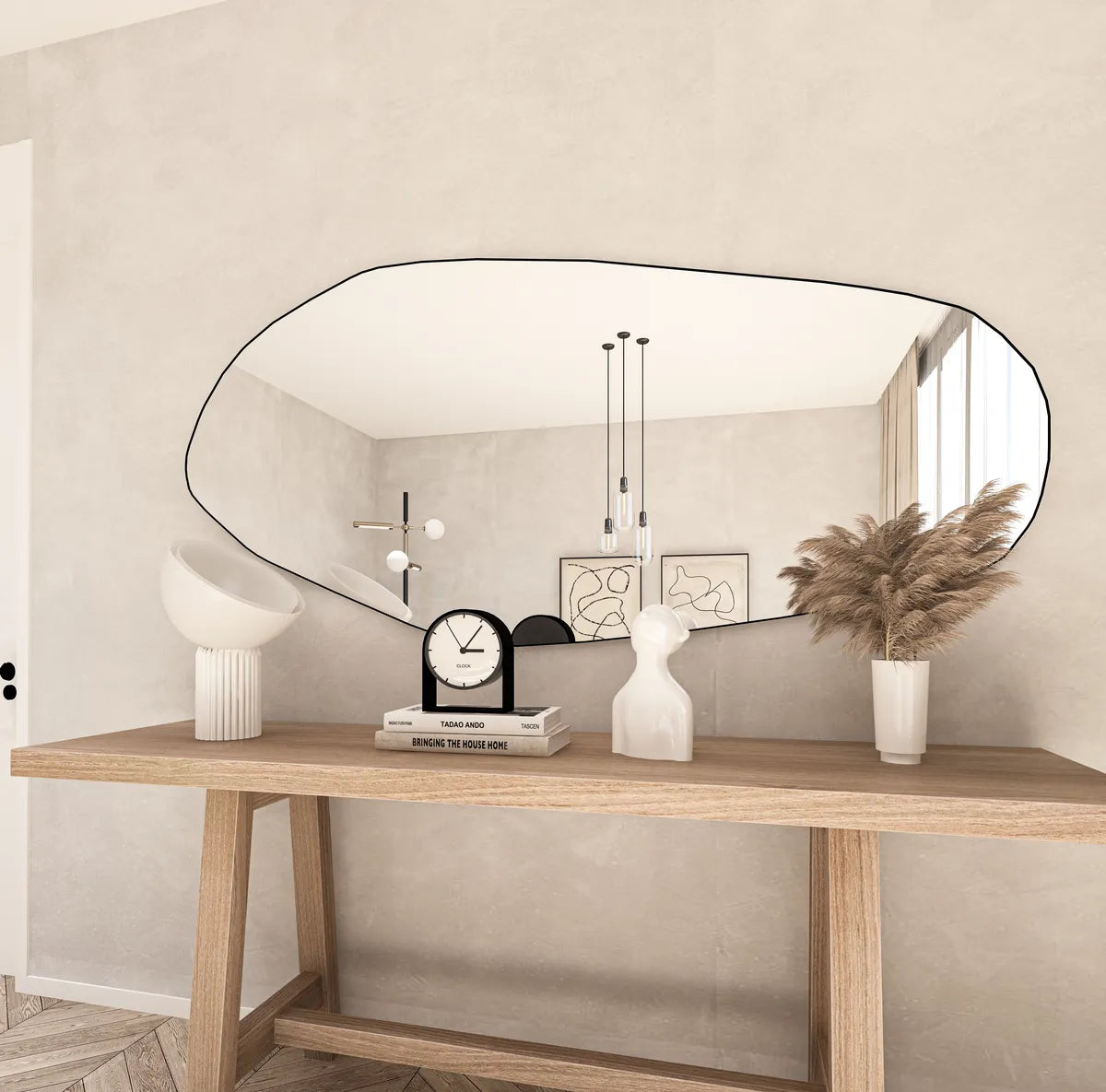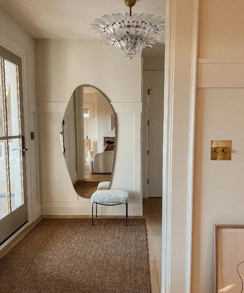 Asymmetrical and Unique Design: This mirror features an asymmetrical design with a slightly curved edge, giving it a modern and stylish look. The irregular shape and unique textures add depth and character to any room.