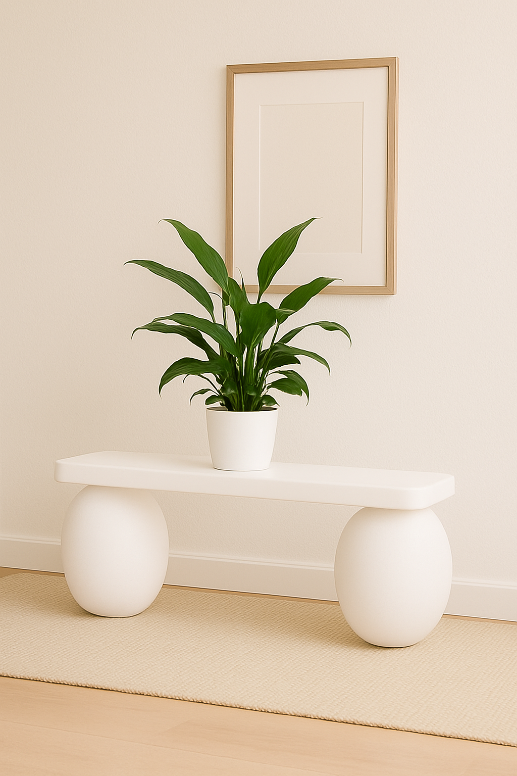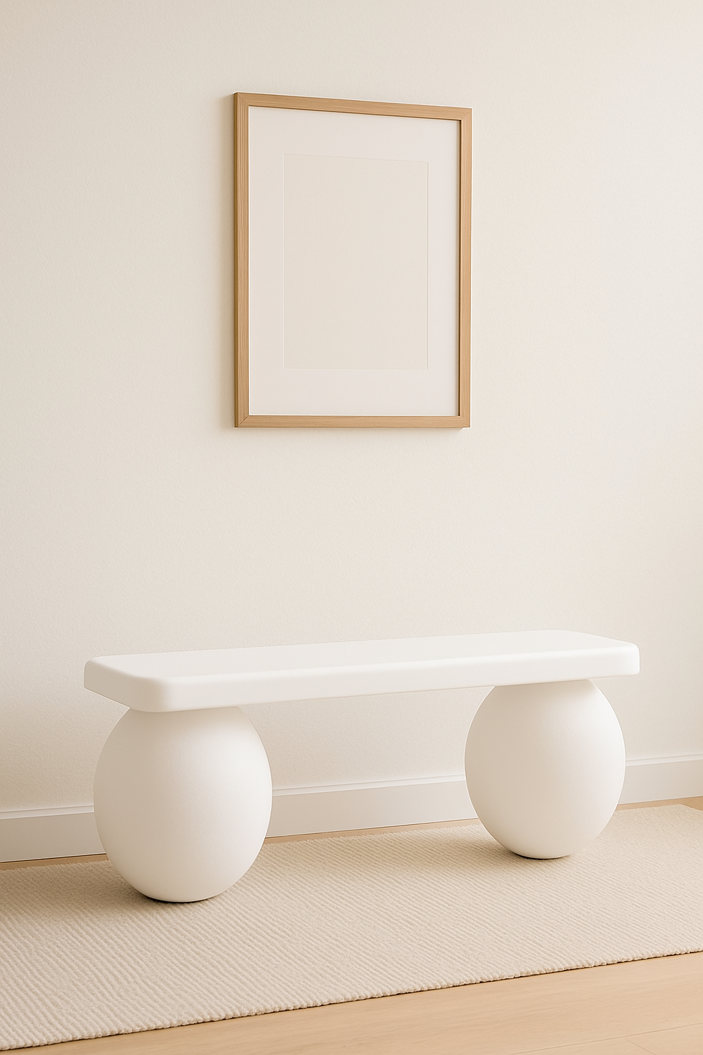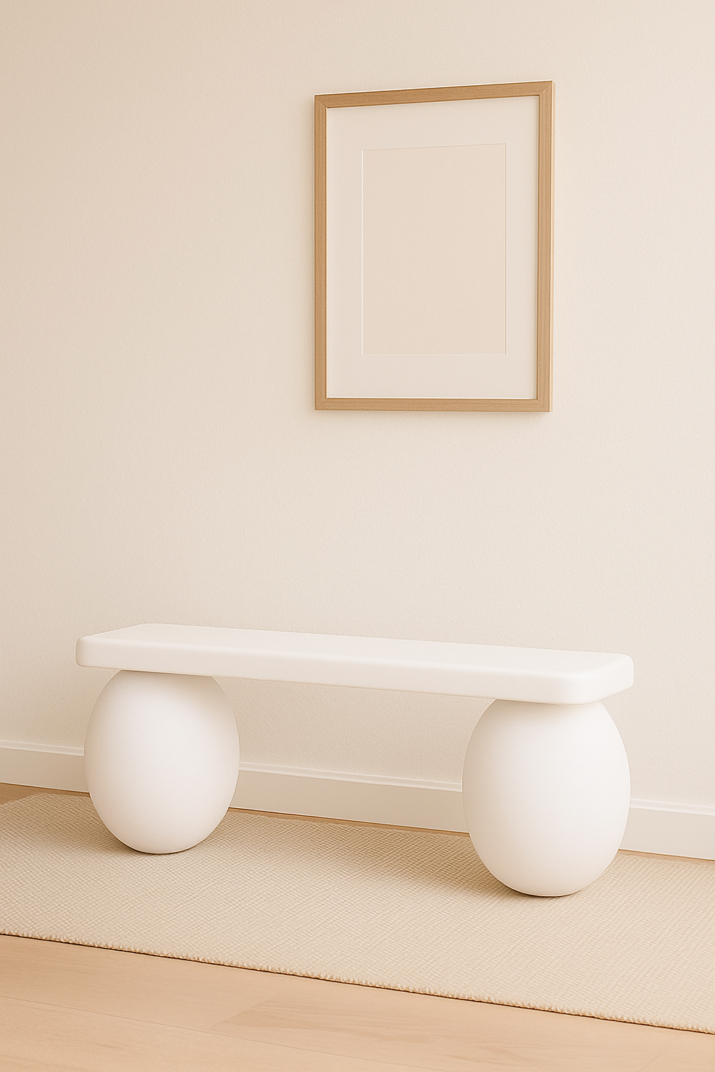 This handcrafted matte white bench is more than a seat — it's a quiet statement in your entryway, bedroom or hallway. With its smooth, grain-free finish and sculptural round legs, it brings warmth to minimal interiors, evoking a sense of softness and light.