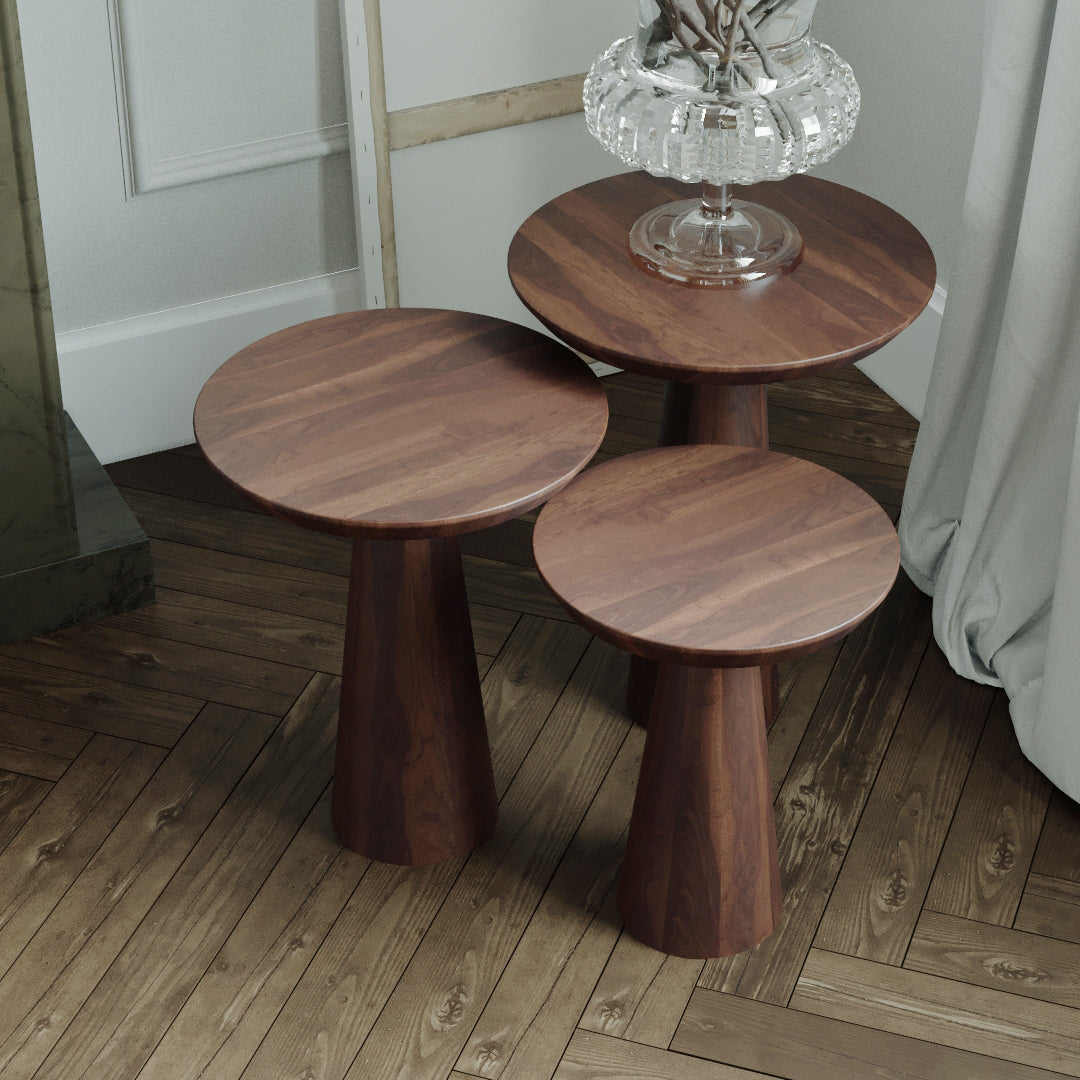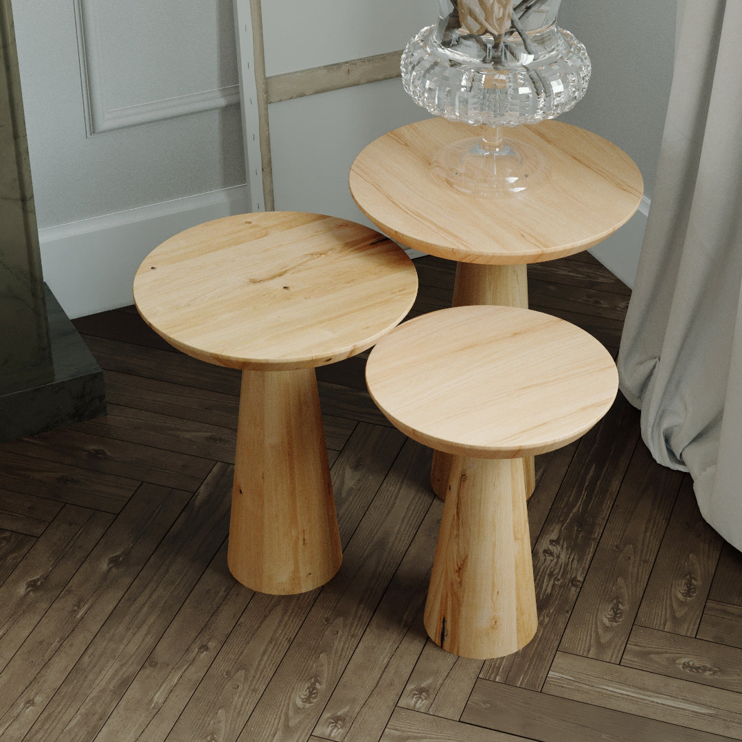 Available in single units or sets of two and three, our Mushroom Side Tables offer flexibility to accommodate your space requirements. With tabletop diameters fixed at 13.75 Inch (35cm) across all sizes, each table boasts its own unique natural wood grain patterns, adding a touch of organic beauty to your environment.